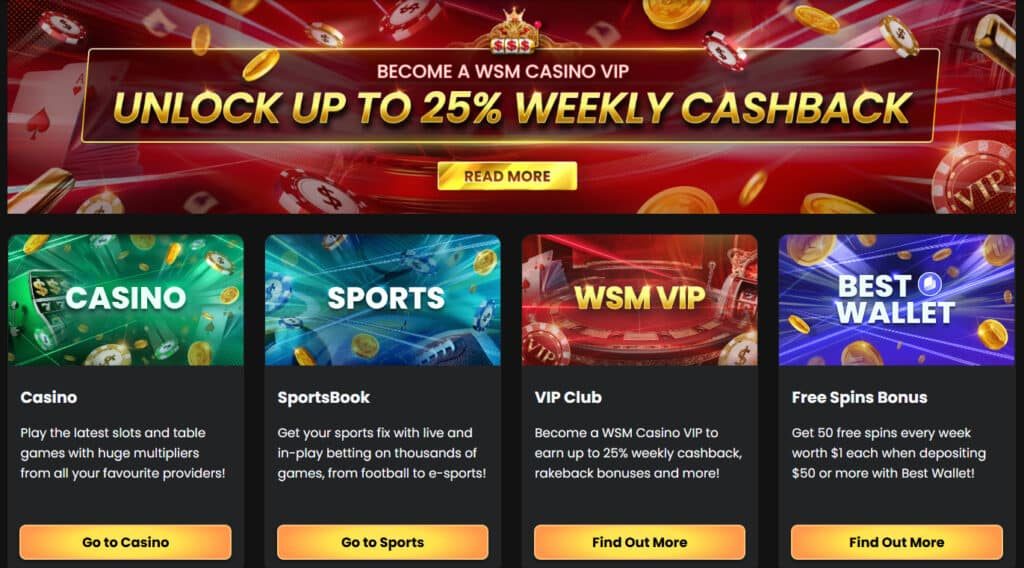 - WSM Casino – 深度融合币圈迷因文化与 VIP 制度,是具备强烈社区归属感的圣地。